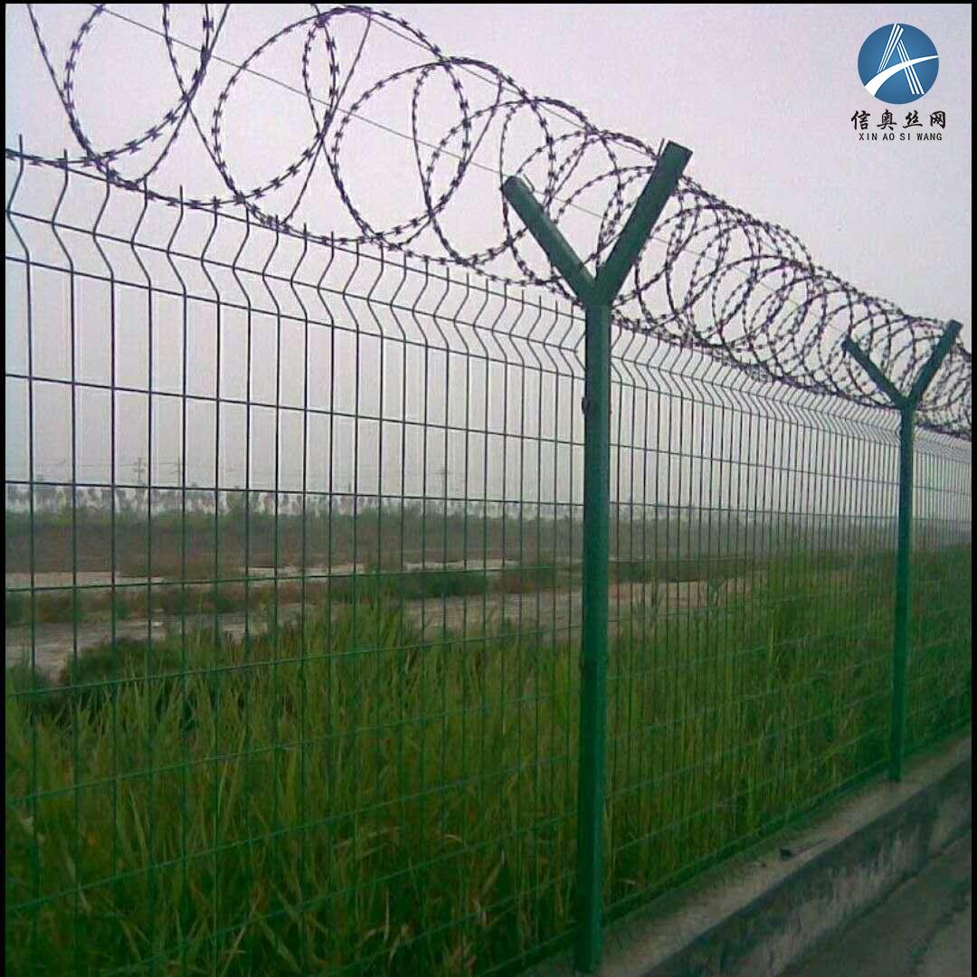 機場護欄網又稱作“Y型安全防護護網”,是由V型支架立柱,加強型焊接片網,安全防盜銜接件和熱鍍鋅刀片刺籠構成強度和安全防護性等級很高。這些年,被應用在機場,軍事基地等高安全場所。注:如果在機場護欄網頂部加裝刀片刺絲、刀片刺繩后又好的增強了安全防護功能。選用電鍍、熱鍍、噴塑、浸塑等防腐辦法,具有好的、抗曬、耐候等特色。其商品外型漂亮、花色多樣,既起到圍欄效果,又起到美化效果。因為具有安全性高、防攀爬才能好,網片銜接辦法選用特制SBS緊扣件,有效避免人為的破壞性拆開,橫向四道折彎加強筋,使網面強度明顯添加。